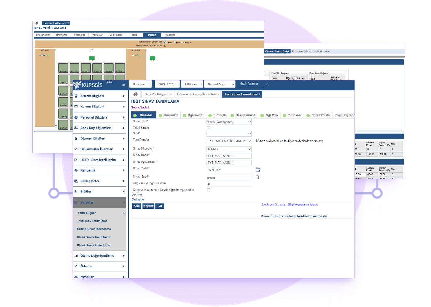 kursunuzda uyguladığınız klasik (açık uçlu) sınavlarınızı öğretmenleriniz kolayca soru puanlarını girerek değerlendirebilirler. Soru bankası modülünden soru kitapçığı hazırlayıp, ölçme Değerlendirme modülü bağlantısı ile bu sınavlara ait konu ve kazanım analizleri alabilir ve sınıf karşılaştırmaları yaparak detaylı analizler alabilirsiniz