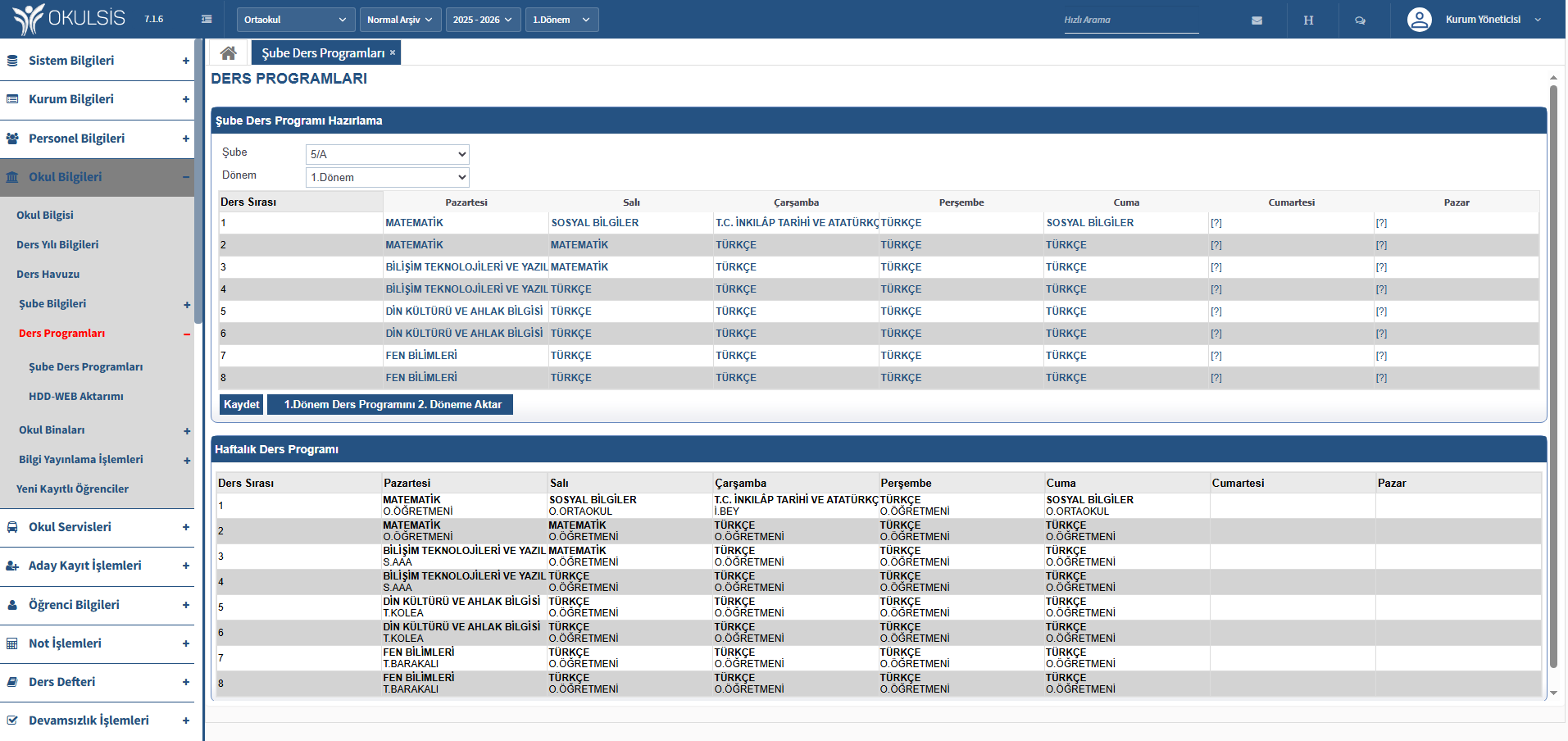 Dersler, seçmeli dersler, öğrenci ve öğretmen bilgileri merkezi sistemden alınabilir; sınıf ders programları merkezi sisteme gönderilebilir.