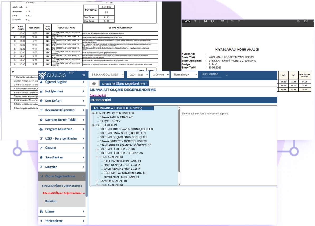 İl, İlçe, kurum, sınıf ve öğrenci bazında sonuç belgeler, mukayeseli listeler, sıralama listeleri, net listeleri, başarı karneleri, başarı grafikleri, standarda ulaşmayan konu listeleri, konu, madde ve kazanım analizleri alınabilir.