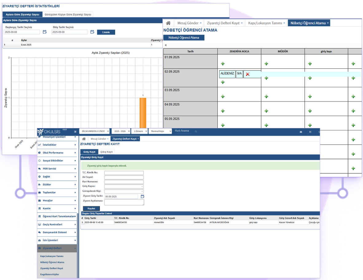 Okul girişinde bulunan güvenlik görevlisi veya nöbetçi öğrenciler tarafından okula gelen ziyaretçilerin kaydı ve çıkış işlemlerini yapın.