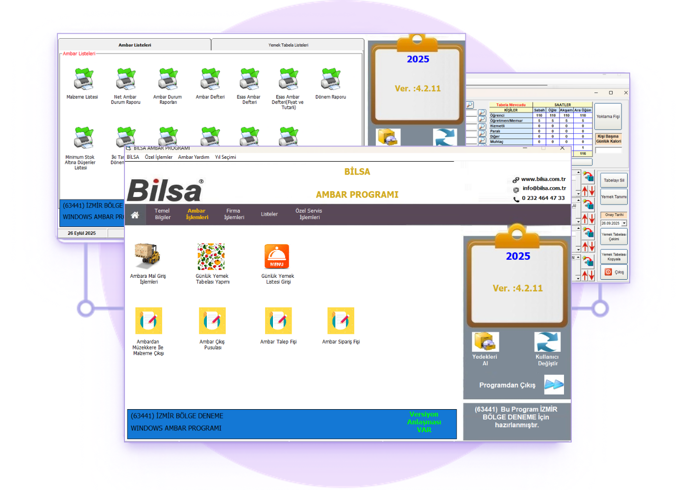 Bilsa ambar programı Milli Eğitim Bakanlığı tarafından yayınlanan yemekhane yönetmeliklerine tam uyumludur. Yemeklerde kullanılacak malzeme ve miktarları ile günlük yemekhane tabelalarınızı kolayca yapın.